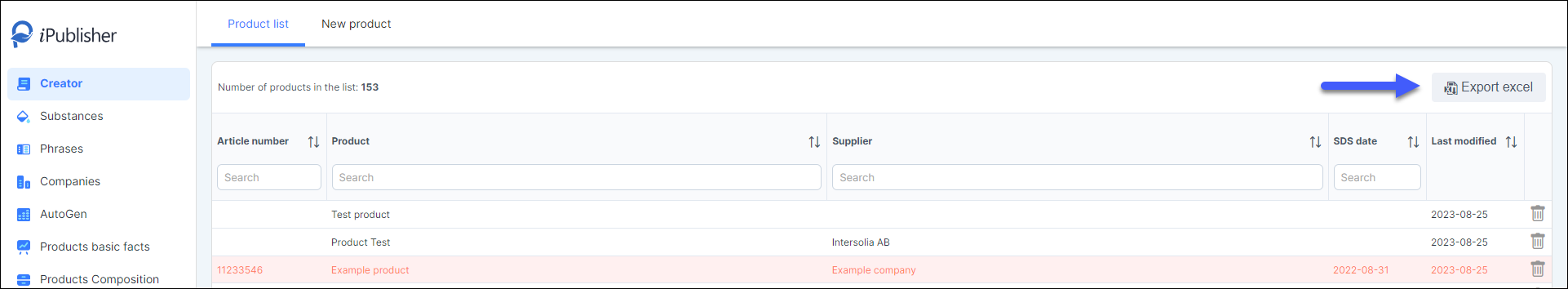 iPublisher offers the possibility to export lists to Excel in Creator, Substances, Companies, AutoGen>Raw material and Publishing.
