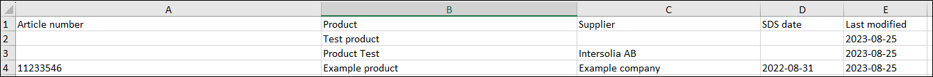 The downloaded excel consists of the columns that exist in the module where you exported the Excel. In this example from Creator it will look like this: