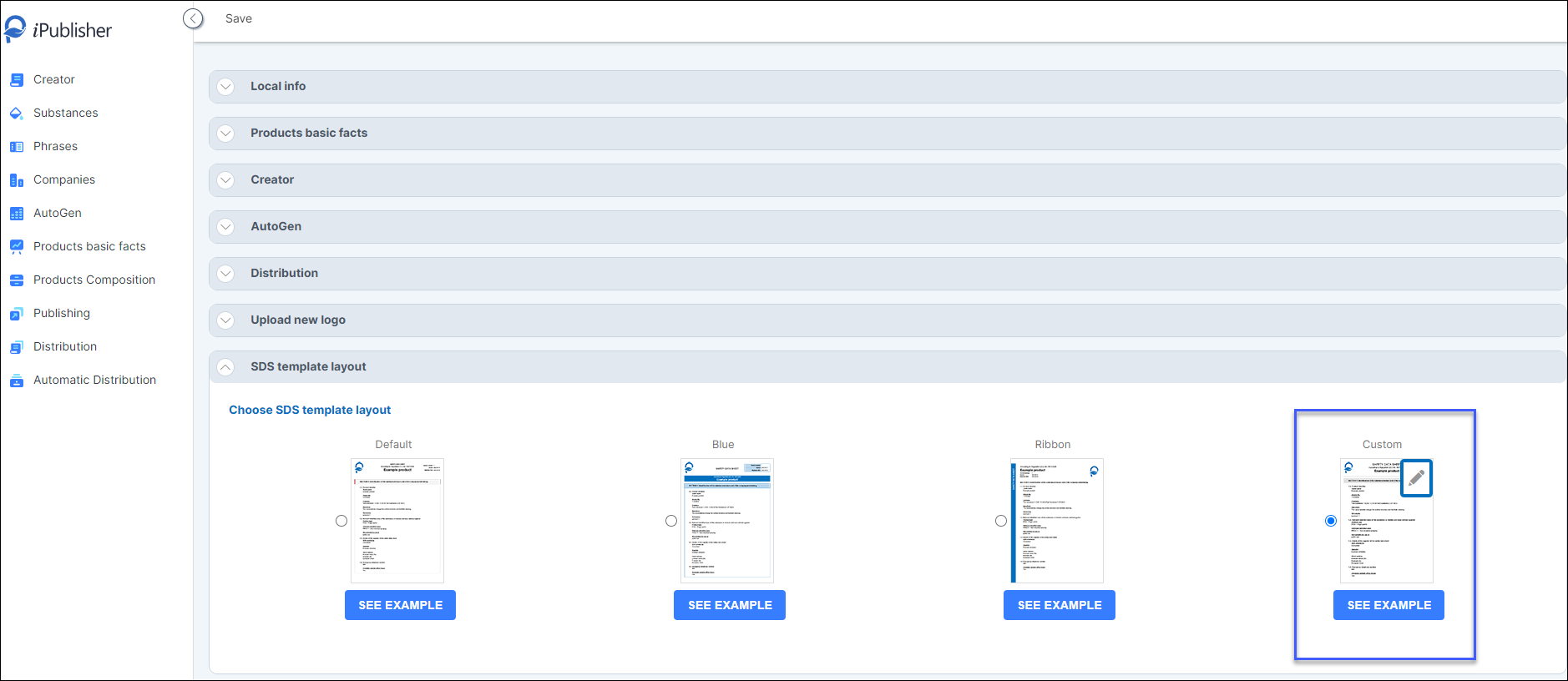 - To set a custom template for your SDS go to the settings page. Go to SDS Template layout and choose Custom the field for the editor will be locked up.