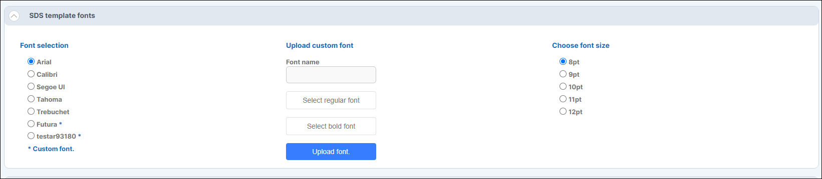 Here you can choose the size of the font you want your bread text in the SDS to have. (This do not regard the headline sizes). You can also select what font type the text should have in the SDS. Choose between these fonts: