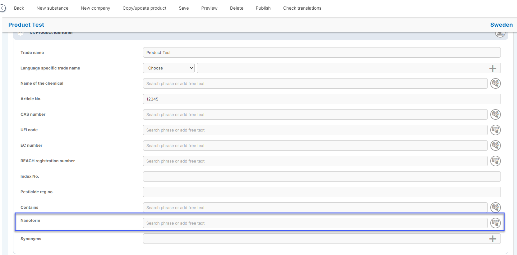 On the right hand of the field there is a book-icon which allows you to either add free text or existing phrases for the Nanoform field.
