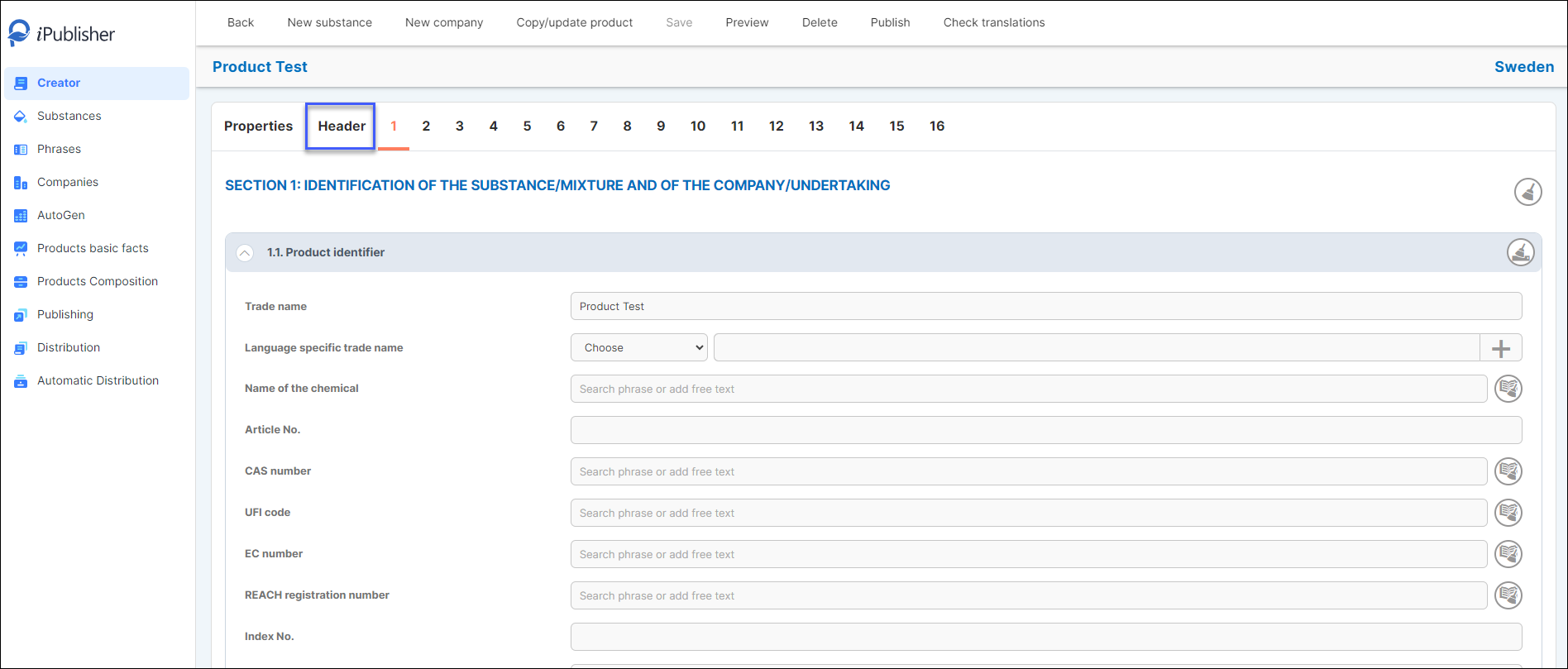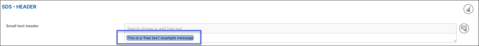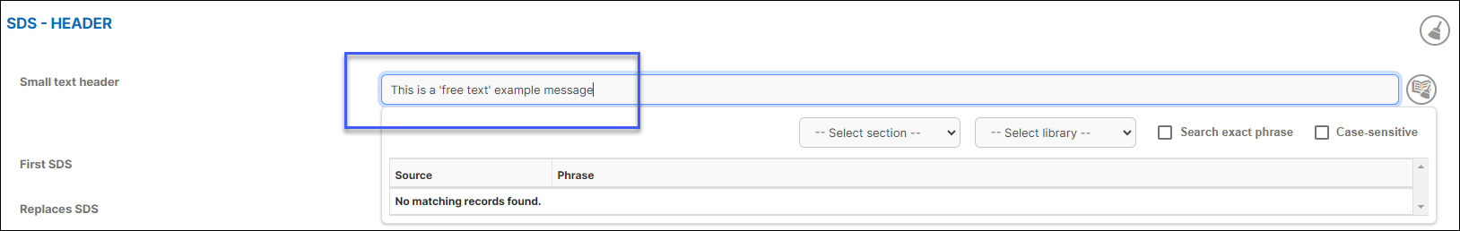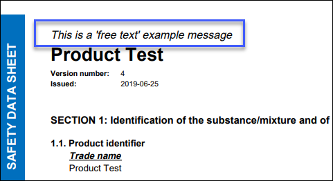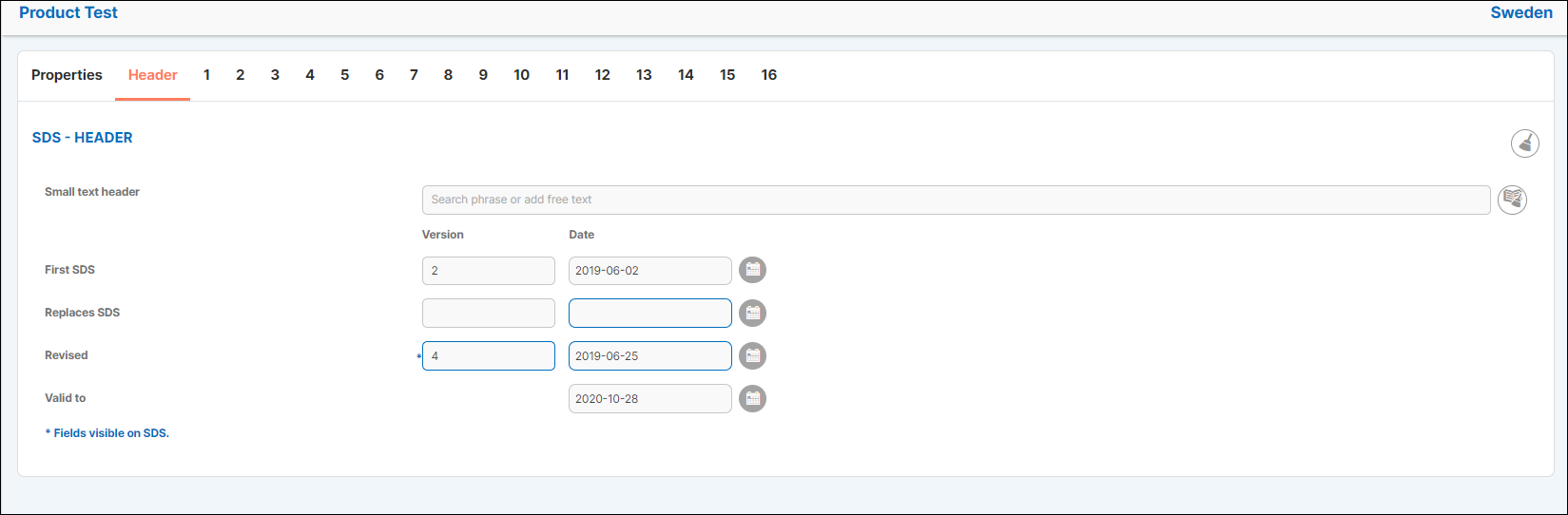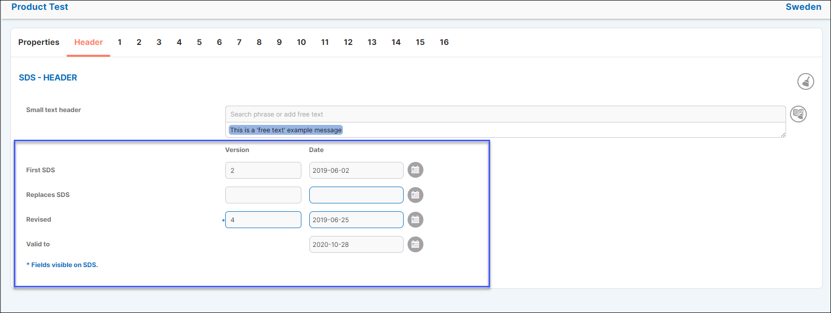 Header (marked in blue) lets the user add dates, when the SDS has been revised and lastly a small text header for their SDS.