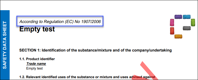 If you leave the Small text header empty it will automatically show "According to Regulation (EC) No 1907/2006" on the pdf.
