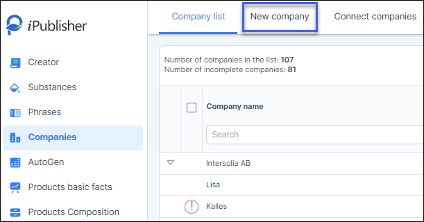 To create a new company to be used in your safety data sheets, simply click on 'New company'.