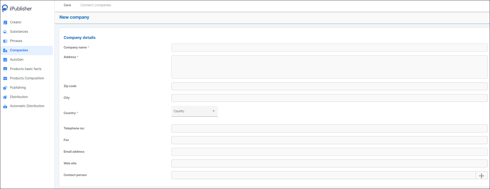 iPublisher offers users the possibility to create, edit and connect local companies to main companies.
