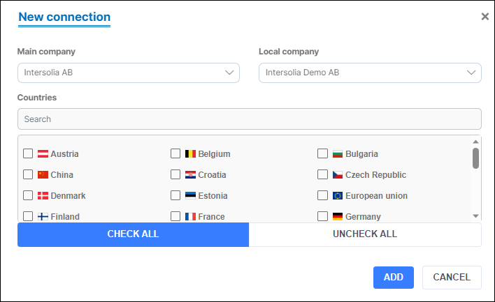 Connecting a local company to a main company simplifies administration when you have one manufacturer but several local distributors. To connect companies click 'Connect companies'.
