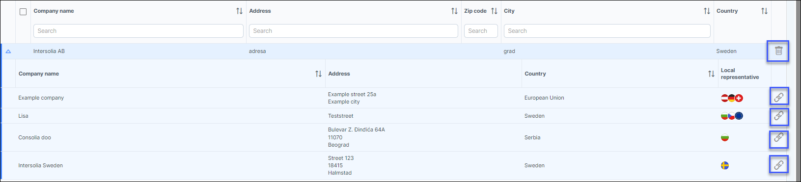 Deleting a company is done by clicking on the dustbin-icon marked in blue.