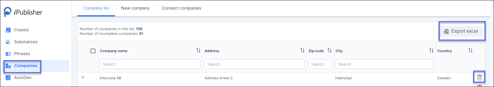 In this view a user can search and filter their different companies and export them to excel if needed using the Export excel-button. To delete a company, simply click on the garbage can-icon to the right.