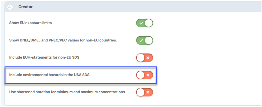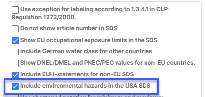 To have this enabled by default, and include environmental hazards to all US SDS, simply click on the three-dotted option and choose Settings and enable 'Include environmental hazards in the USA SDS'.