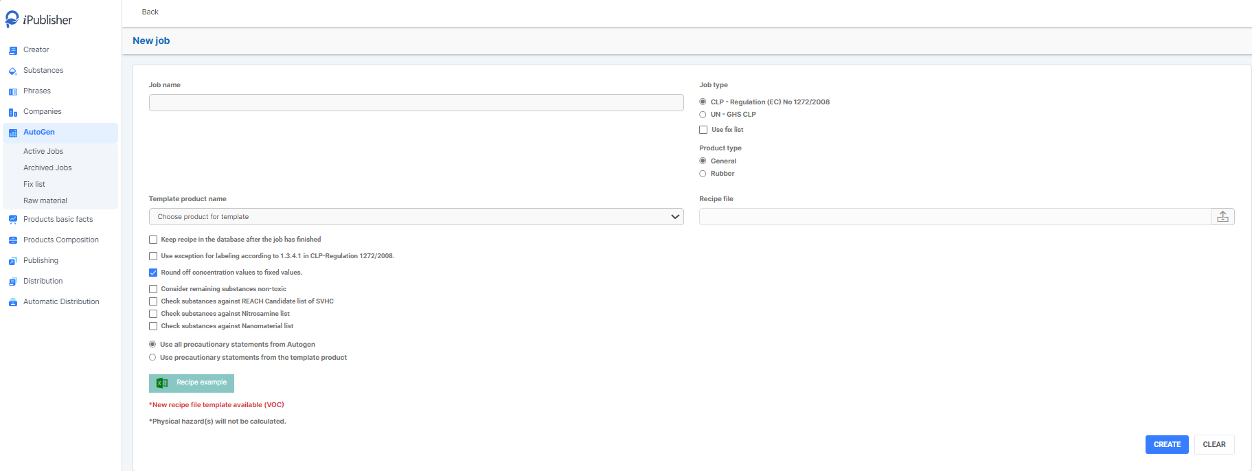 To create one or more products using recipe, a job must be created. Use the template for the recipe file from AutoGen. Columns in the recipe file should not be changed, otherwise AutoGen will not be able to use the document.