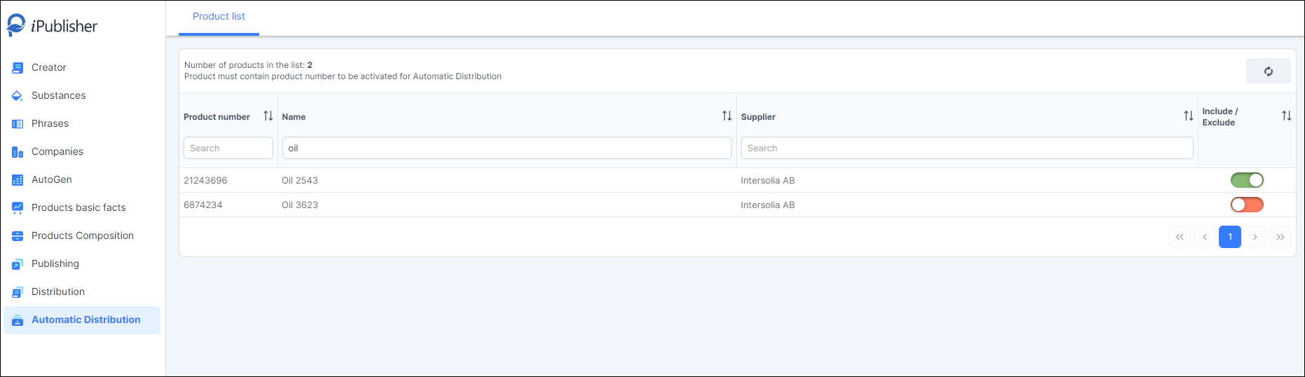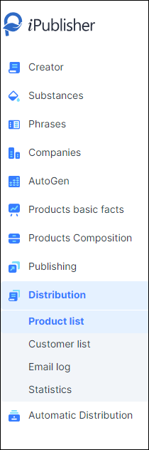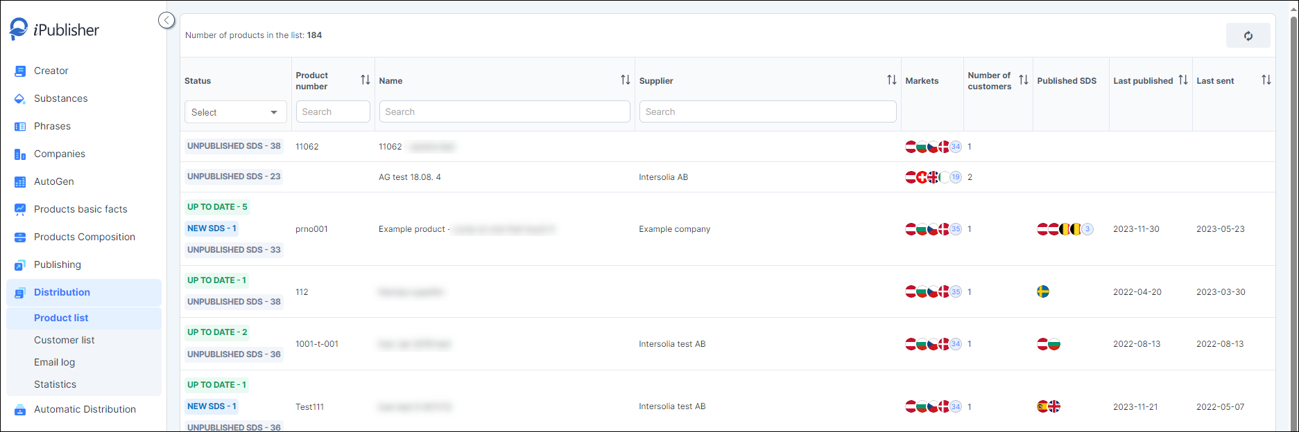 The primary product list (PL) contains all created products generated via Creator and AutoGen. This comprehensive list provides a swift overview of statuses such as sent, unpublished, and SDSs waiting to be sent. Additionally, it furnishes users with details regarding published and requested SDSes for each product. Similar to other sections in iPublisher, this list can be filtered based on various criteria and sorted by multiple columns.