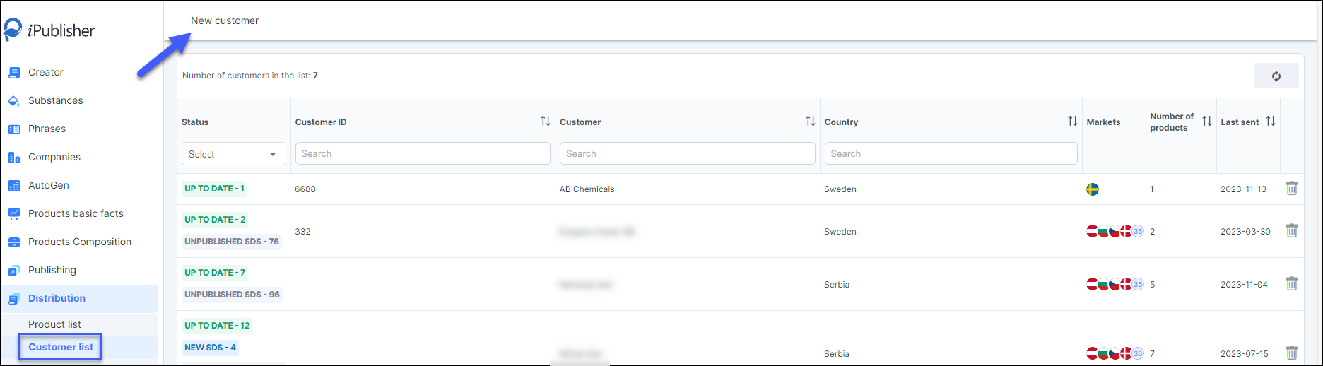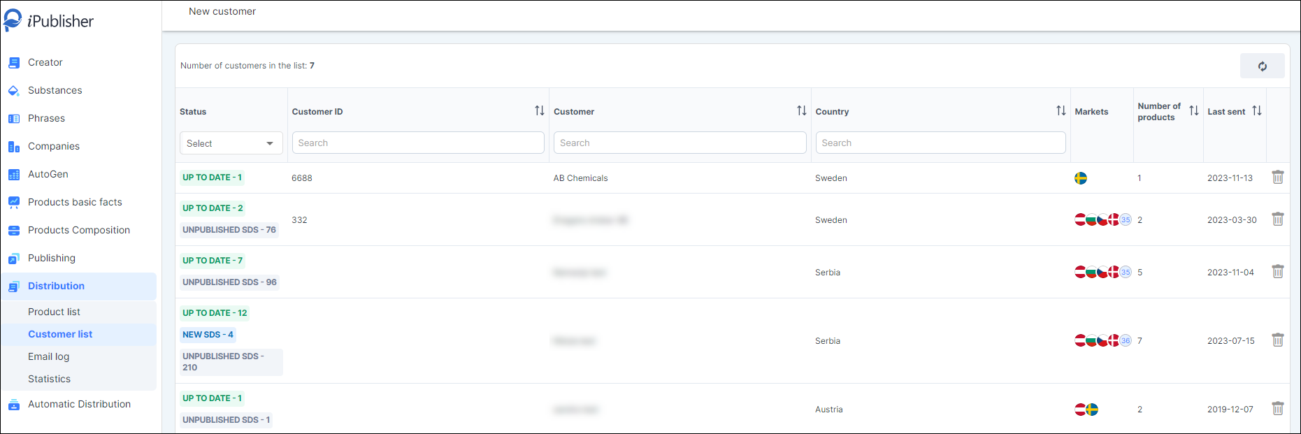 Each customer profile includes general information such as ID, name, and country, alongside details about the statuses of their products/SDSs, requested markets, the number of products on their lists, and the date of the last distribution.