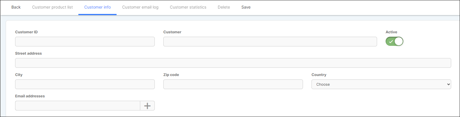 To add a new customer, essential information must be provided, including their name, country, and at least one email address. To add email(s), click on the 'Add' button ( ). Once all necessary information is entered, click 'Save' to create the new customer profile.