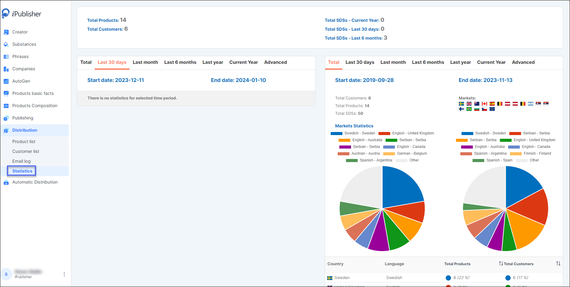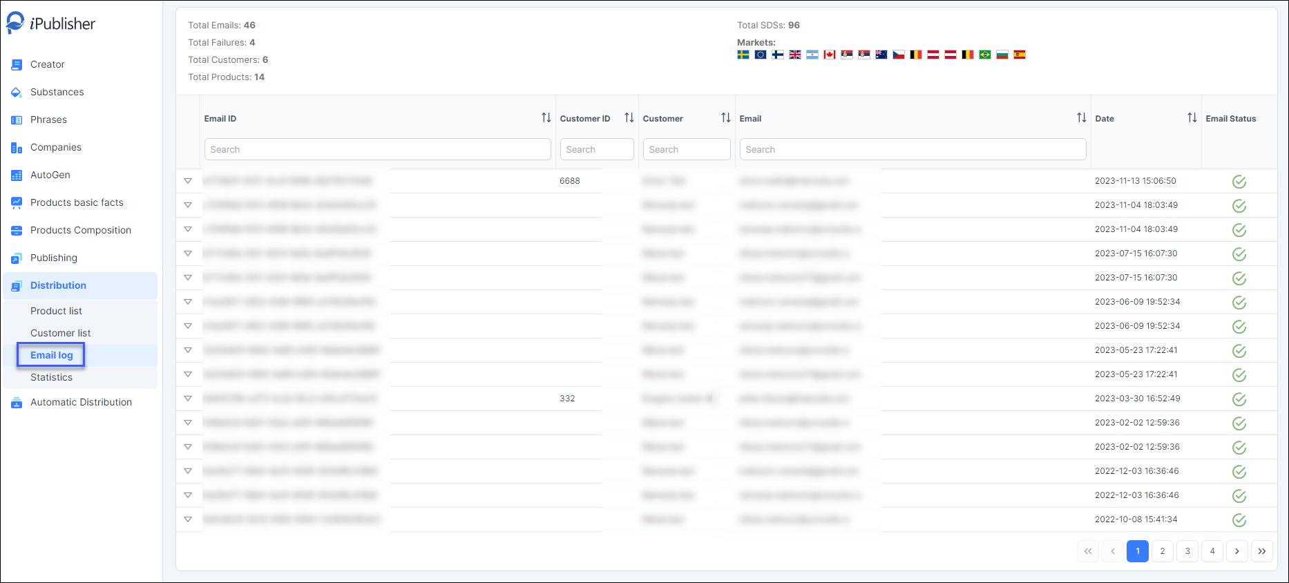 The primary email log encompasses all emails dispatched through the Distribution module. At the top of the page, there's an overview of sent emails, detailing the total count of sent emails, failed emails, the overall count of customers receiving SDSs, and the total number of sent SDSs, along with a breakdown by markets.