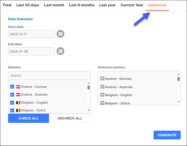 Within the 'Advanced' tab, users can specify the timeframe and list of markets for which they need statistics. Once the criteria for the statistics are set, simply click the 'Generate' button.